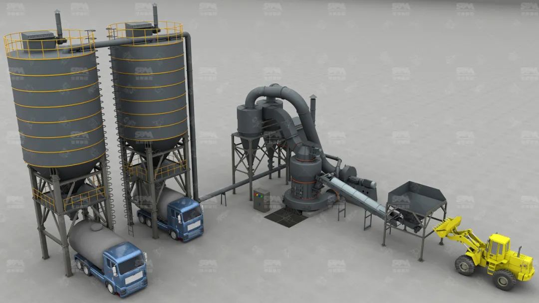 原料經(jīng)變頻皮帶給料機均勻定量連續(xù)地送入主機磨室內(nèi)進行研磨。粉磨后的物料被風(fēng)機氣流送入選粉機進行分級,在分析機的作用下,不符合細(xì)度要求的物料落入磨室內(nèi)重新碾磨,合格的物料則隨氣流經(jīng)管道進入旋風(fēng)集粉器內(nèi),進行分離收集,經(jīng)排料裝置排出即為成品粉體。分離后的氣流通過旋風(fēng)集粉器上端回風(fēng)管進入風(fēng)機。該生產(chǎn)系統(tǒng)在負(fù)壓密閉條件下運行,并配有脈沖除塵器無粉塵外溢,符合國家環(huán)保標(biāo)準(zhǔn)。