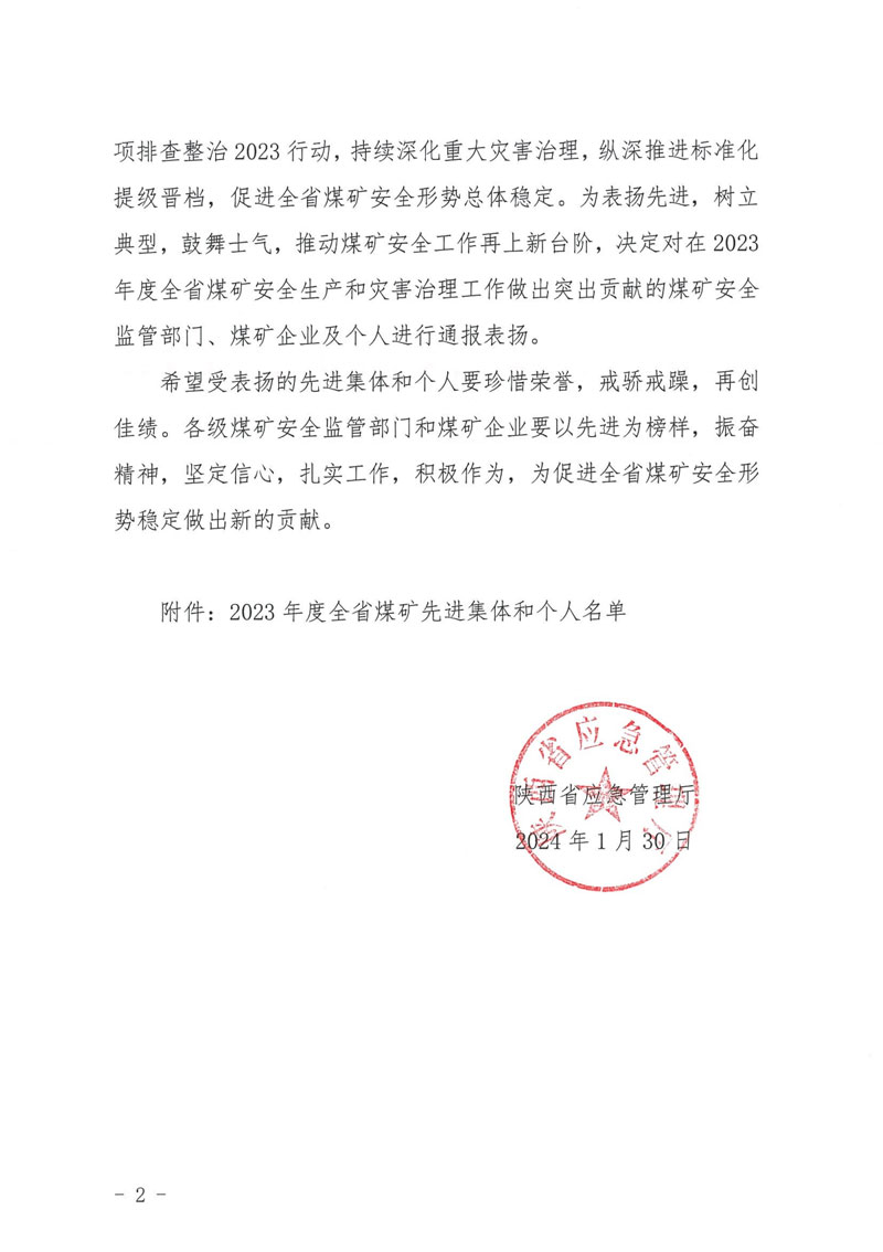 2月1日,陜西省應(yīng)急管理廳在西安國際會議中心組織召開全省煤礦安全工作會議,對2023年全省煤礦安全先進(jìn)集體和個(gè)人通報(bào)表揚(yáng),匯能集團(tuán)所屬錕源煤礦榮獲“陜西省煤礦企業(yè)安全先進(jìn)集體”稱號,這是繼錕源煤礦通過國家一級安全生產(chǎn)標(biāo)準(zhǔn)化管理體系現(xiàn)場定級考核后,取得的又一項(xiàng)重大殊榮。