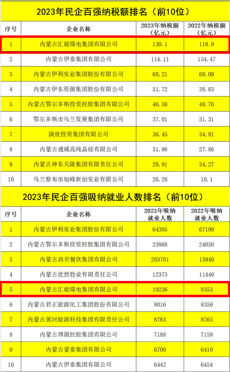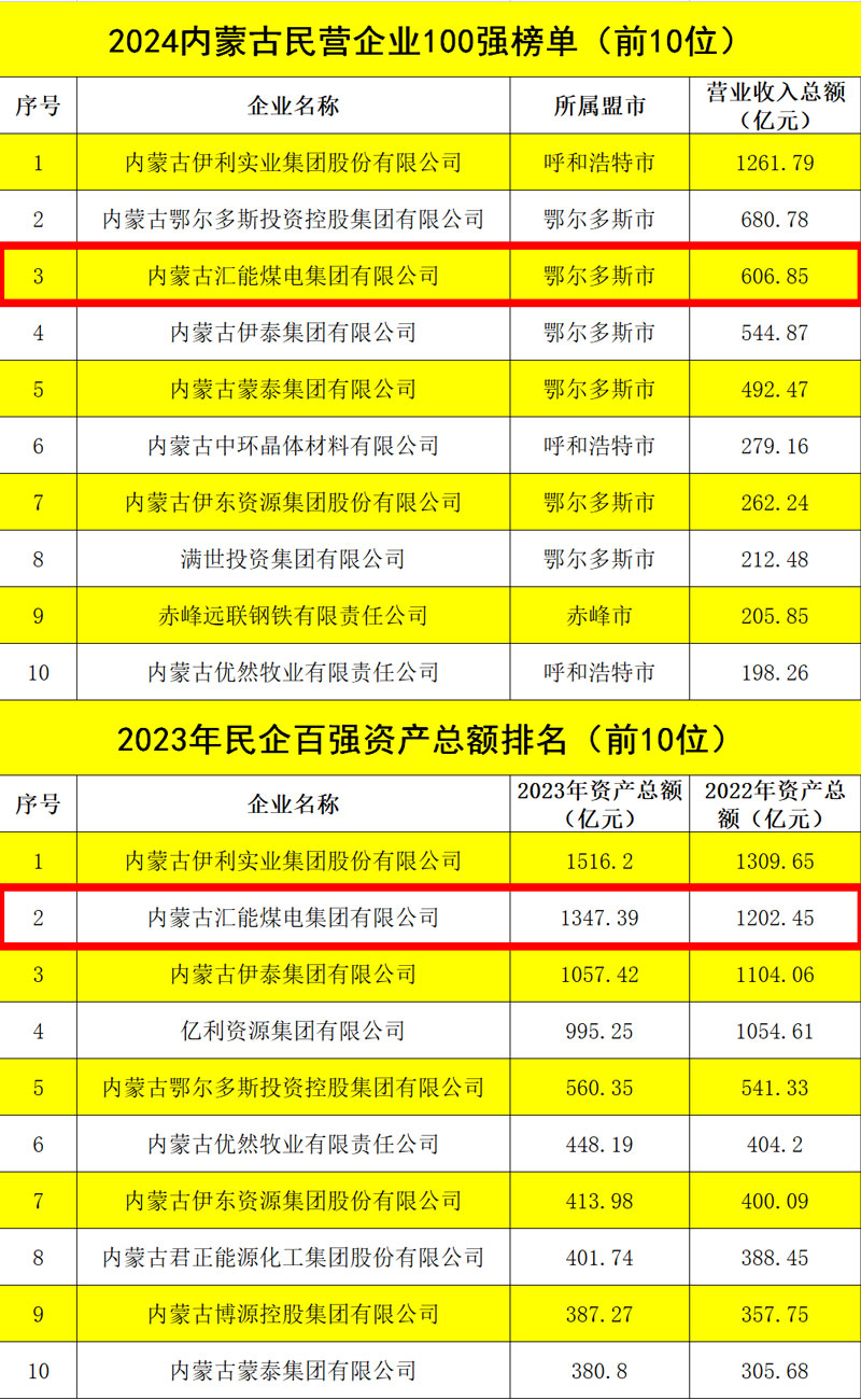 6月25日,2024內(nèi)蒙古民營企業(yè)100強(qiáng)發(fā)布會(huì)暨內(nèi)蒙古自治區(qū)促進(jìn)“兩個(gè)健康”現(xiàn)場會(huì)在內(nèi)蒙古鄂爾多斯市舉行。會(huì)上公布了2024內(nèi)蒙古民營企業(yè)100強(qiáng)系列榜單,匯能集團(tuán)以606.85億元營收總額榮列百強(qiáng)榜單第三位,較上年增長110.41億元,上升一位;資產(chǎn)總額1347.39億元,較去年增長144.94億元,仍位列民企百強(qiáng)第二位;納稅額130.1億元,位列民企百強(qiáng)第一位,較上年增長10.2億元,上升一位;吸納就業(yè)人數(shù)10236人,位列民企百強(qiáng)第五位,較上年增加1883人,上升兩位。