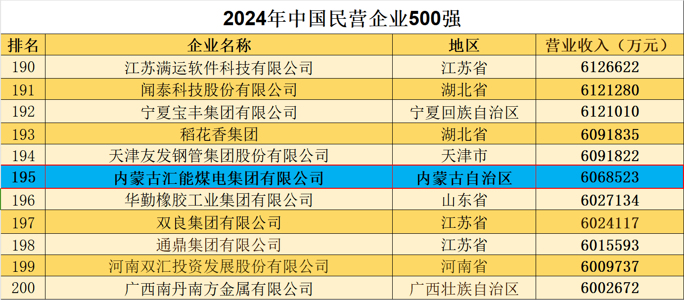 10 月 12 日,全國工商聯發布 2024 中國民營企業 500 強報告并公布榜單。匯能控股集團有限公司(原內蒙古匯能煤電集團有限公司)位列榜單195位,較2023年的240位前進44位。