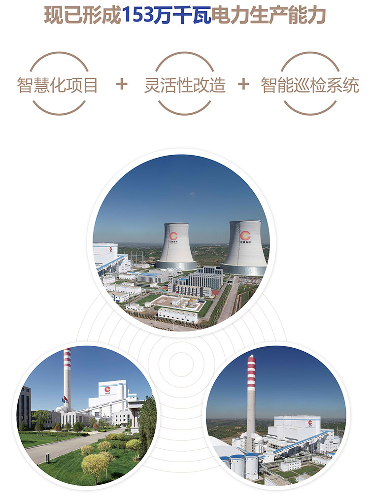 集團共有3座電廠,其中2座建成運行,1座正在建設。2006年,蒙南發電公司2×6萬千瓦供熱機組建成投產。2023年,匯能長灘2×66萬千瓦超超臨界燃煤發電項目并網發電,屬于蒙西至天津南特高壓輸電通道的配套電源點之一,長灘電廠二期工程2×66萬千瓦發電項目正在建設,屆時電力總裝機將達到285萬千瓦。